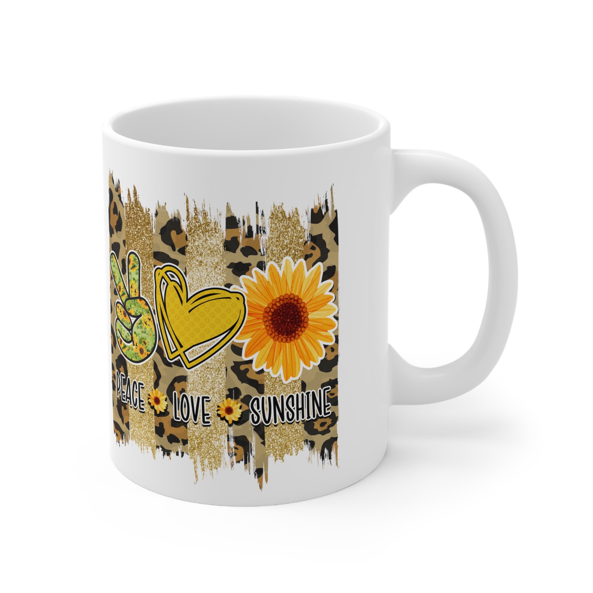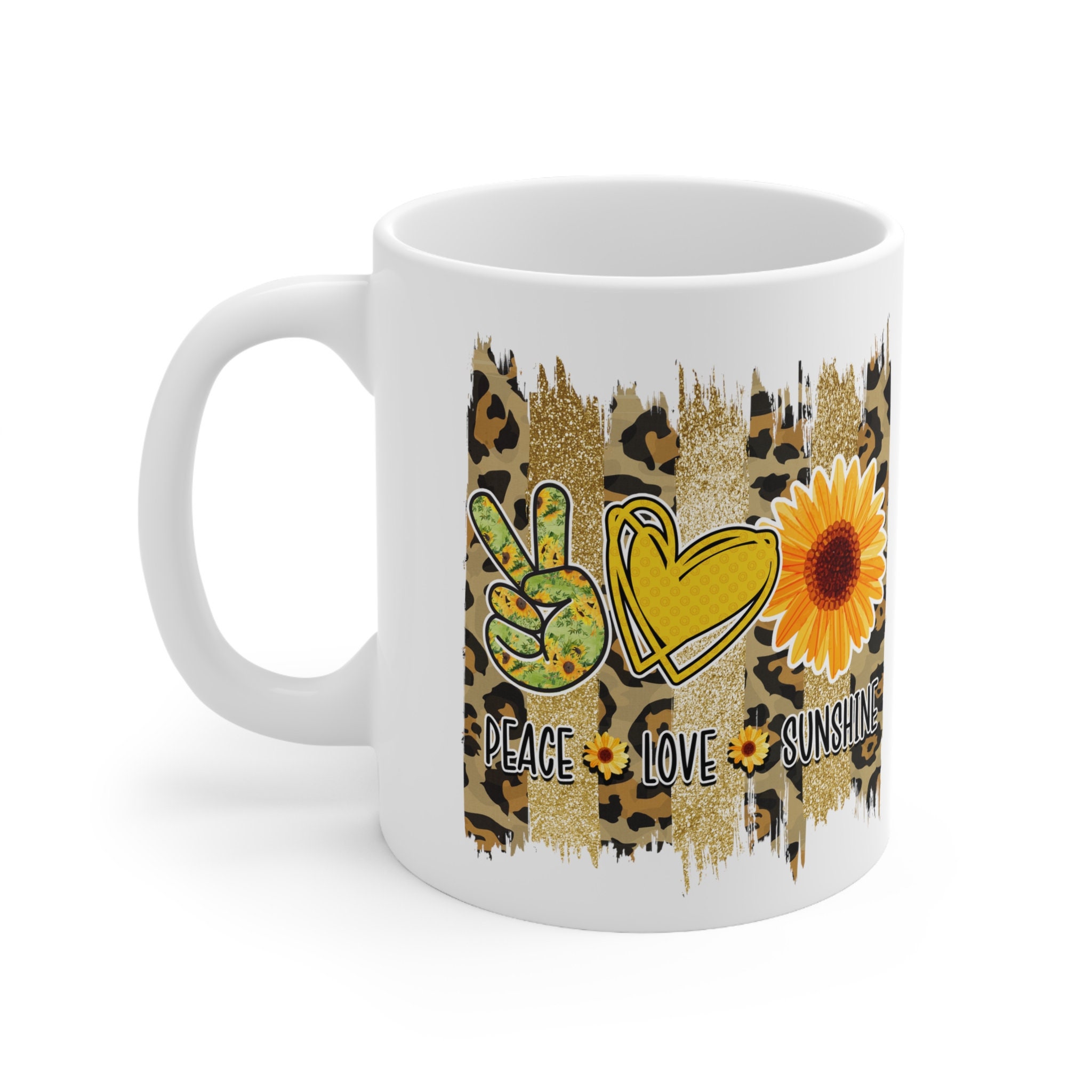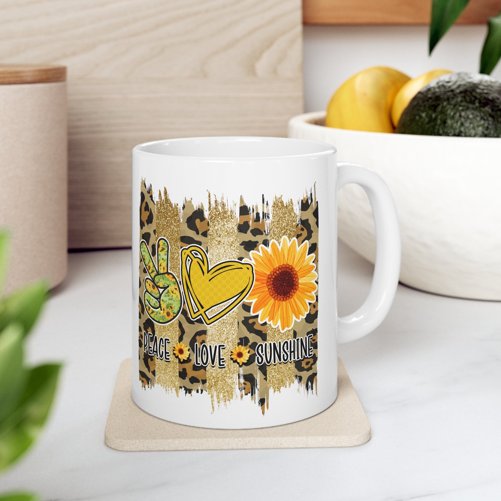 coffee mug, sunshine mug, coffee cup, sunflower mug, peace love sunshine, mothers day gift, sunflower gift, happy mug, gifts for her, mug gift, inspirational mug, sunshine coffee mug, The vibrant design, featuring the words "Love," "Peace," and "Sunshine," serves as a gentle reminder to embrace life's simple joys. Made from high-quality ceramic, this mug is both durable and stylish, making it the perfect companion for your morning coffee or afternoon tea. Start your day right with this uplifting mug that brings a little extra sunshine into your routine.