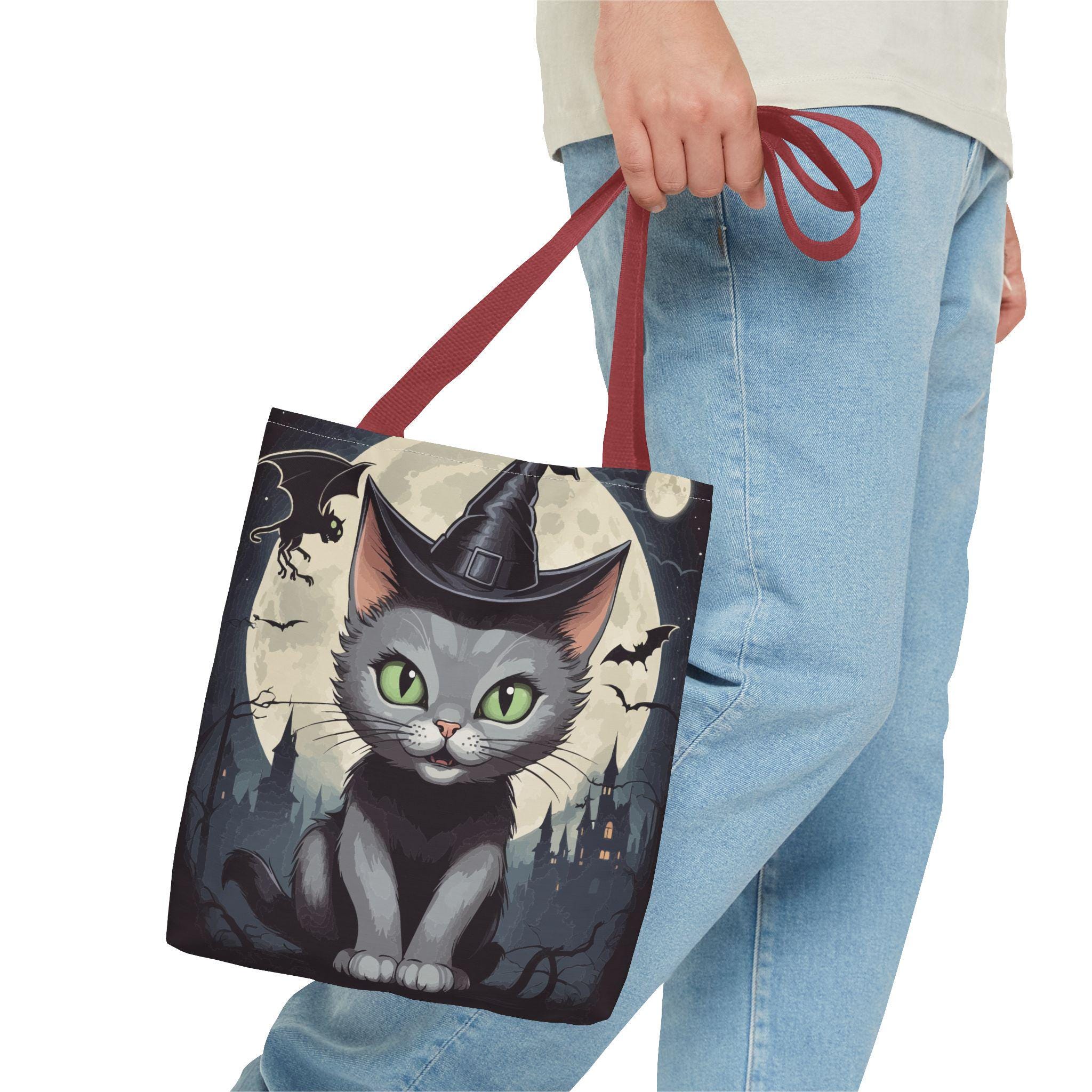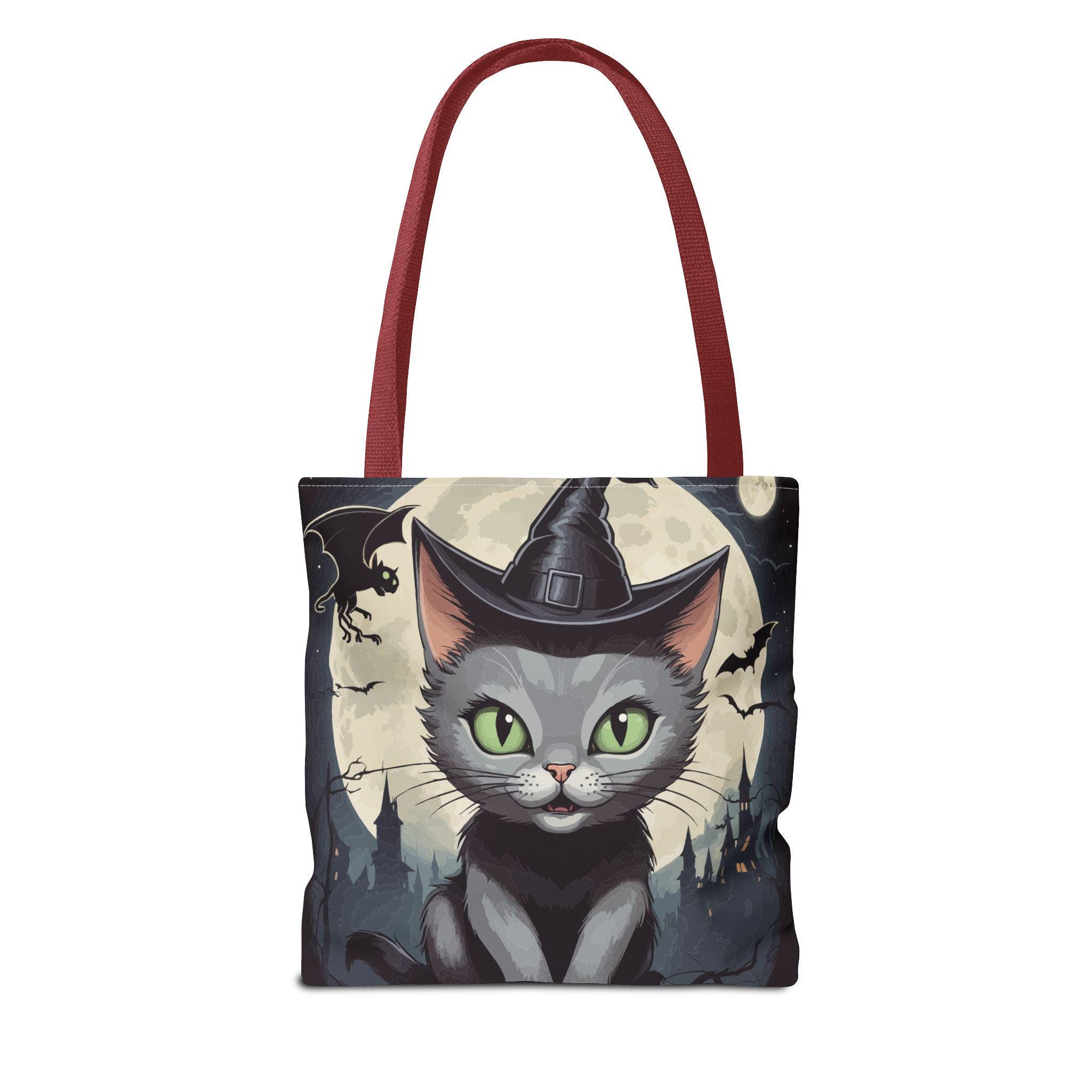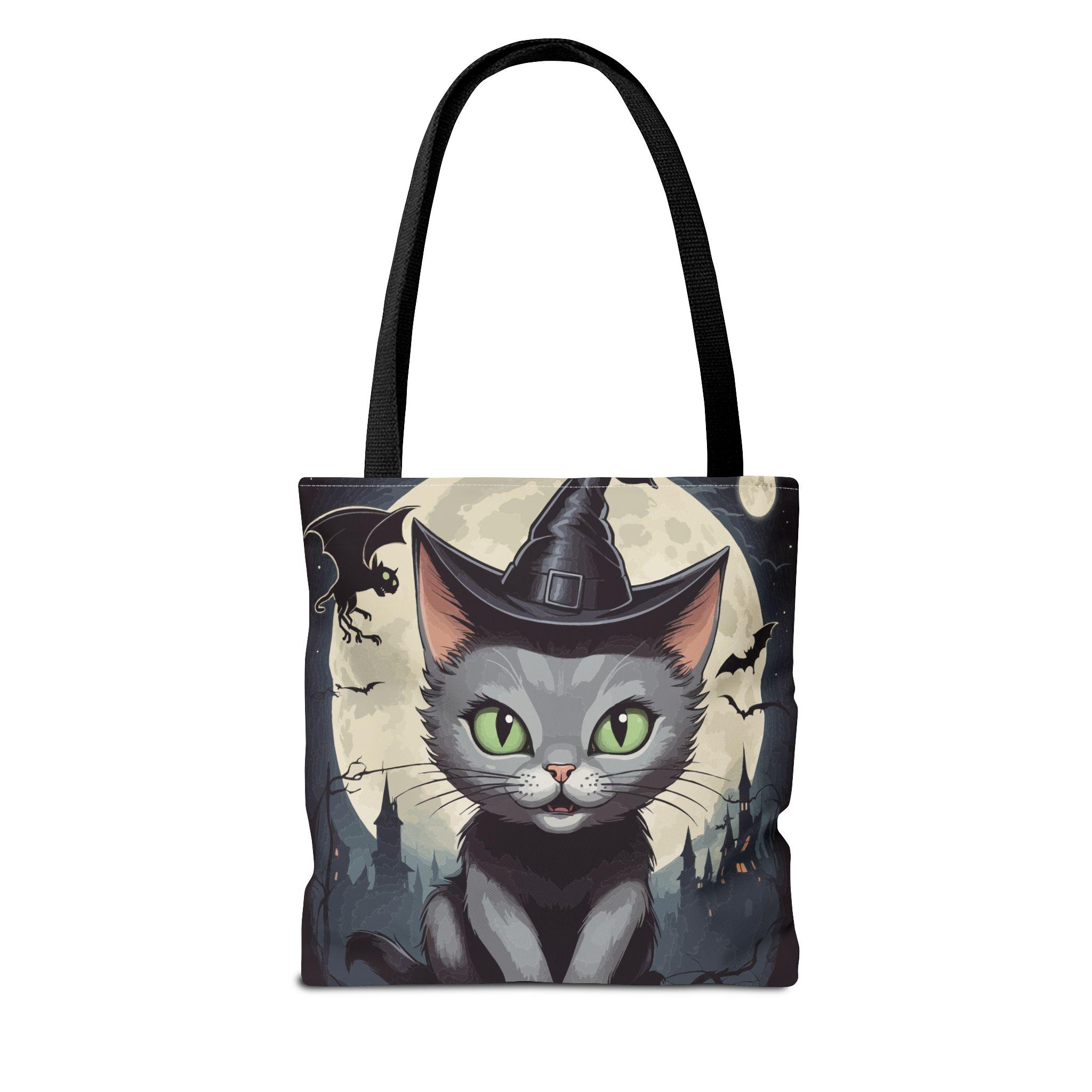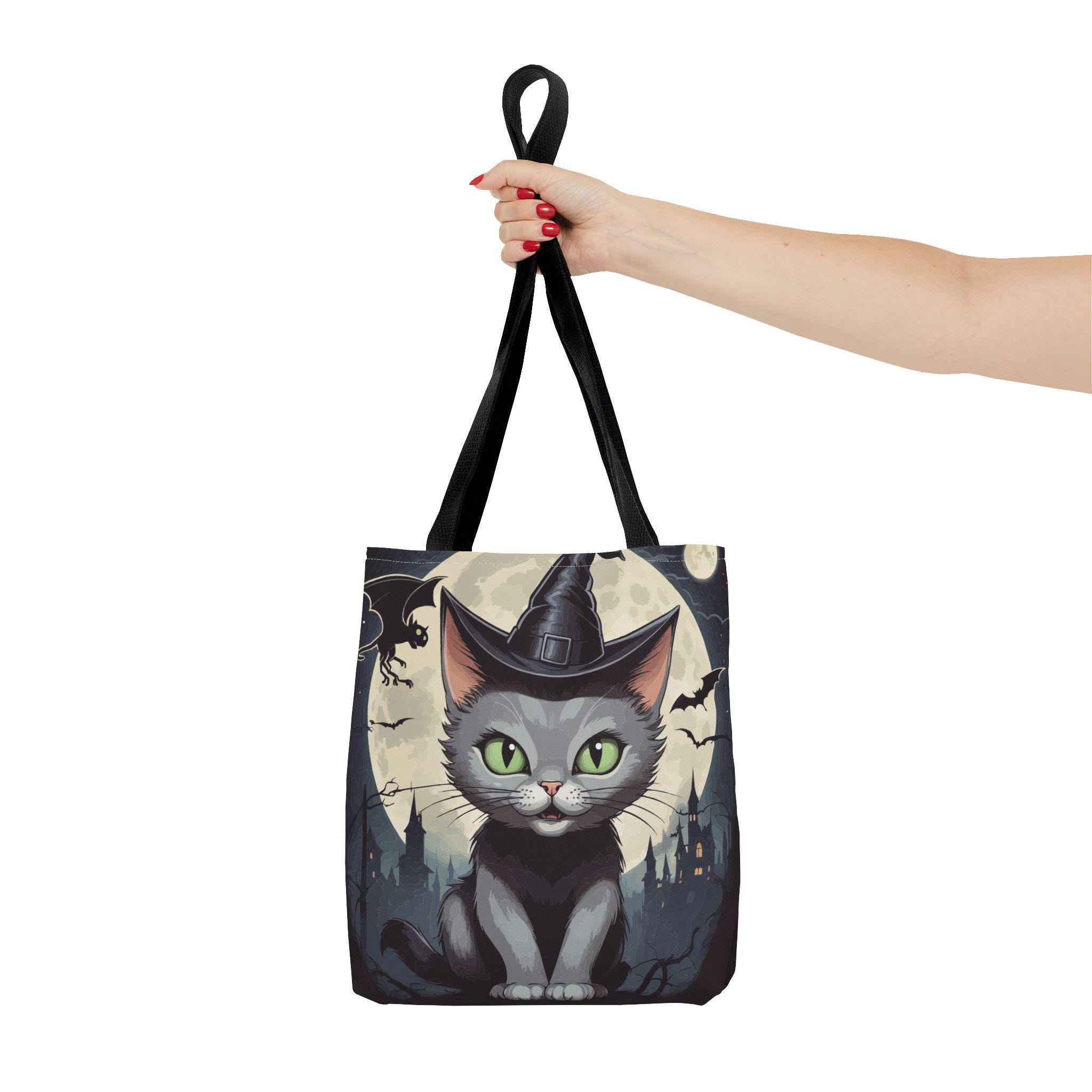 This Black Cat Tote Bag is the purr-fect accessory for Halloween lovers. Show off your feline spirit with this All-Over Print (AOP) bag, ideal for trick-or-treating or as a spooky-themed gift. Available in 3 sizes to add both functionality and style, these custom-printed tote bags come with multiple handle colors to match your designs. Made with spun polyester, these bags feature double-stitched seams, cotton webbing straps, and nonwoven laminate lining for high-end durability. Your all-over print is created with dye sublimation for high-end visuals.