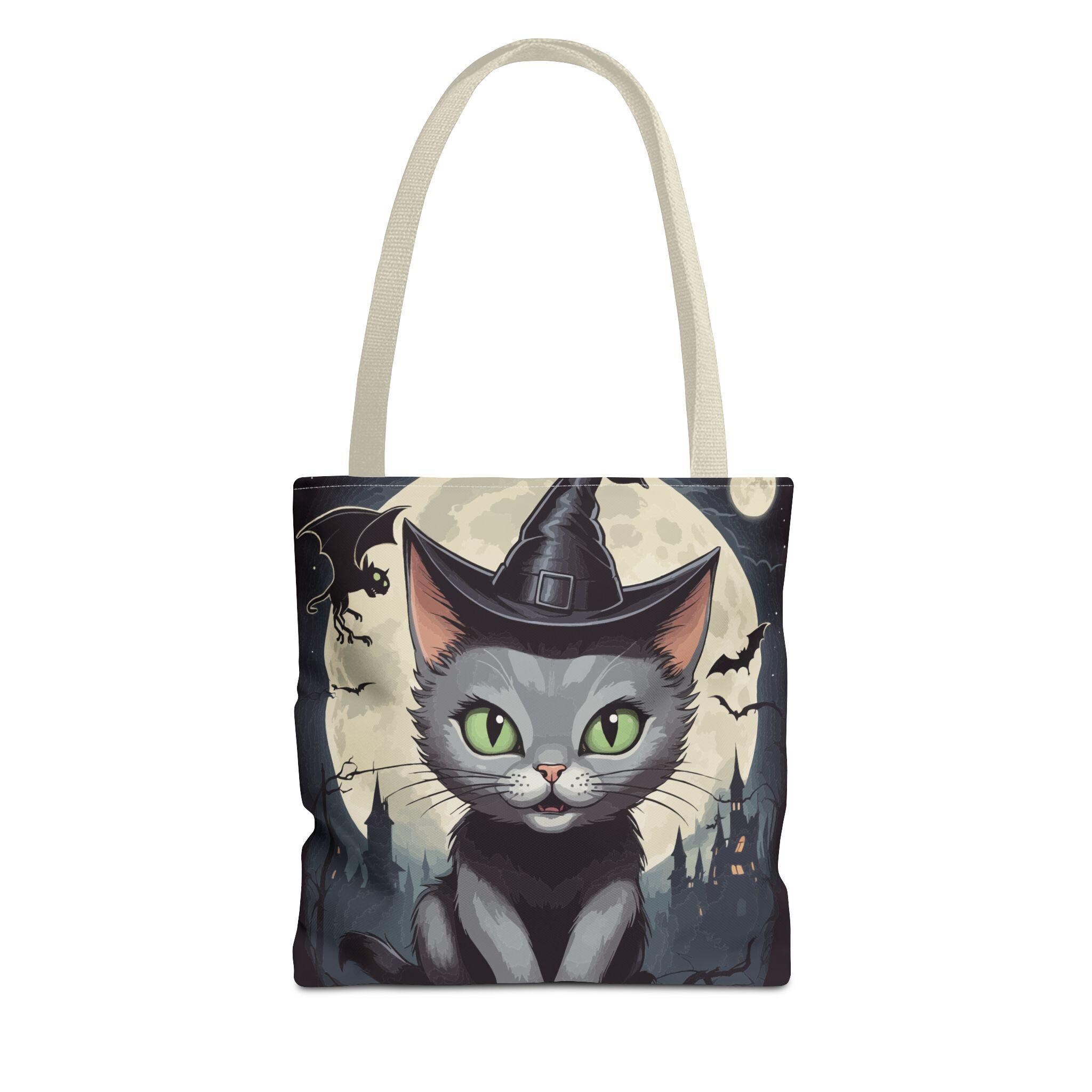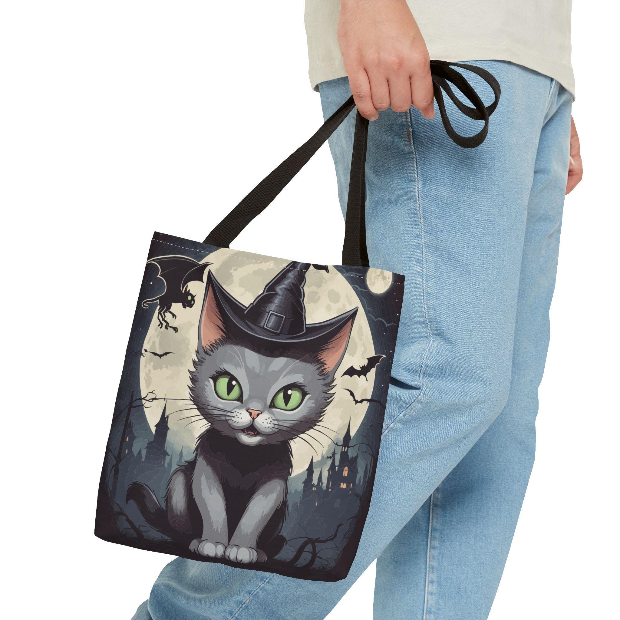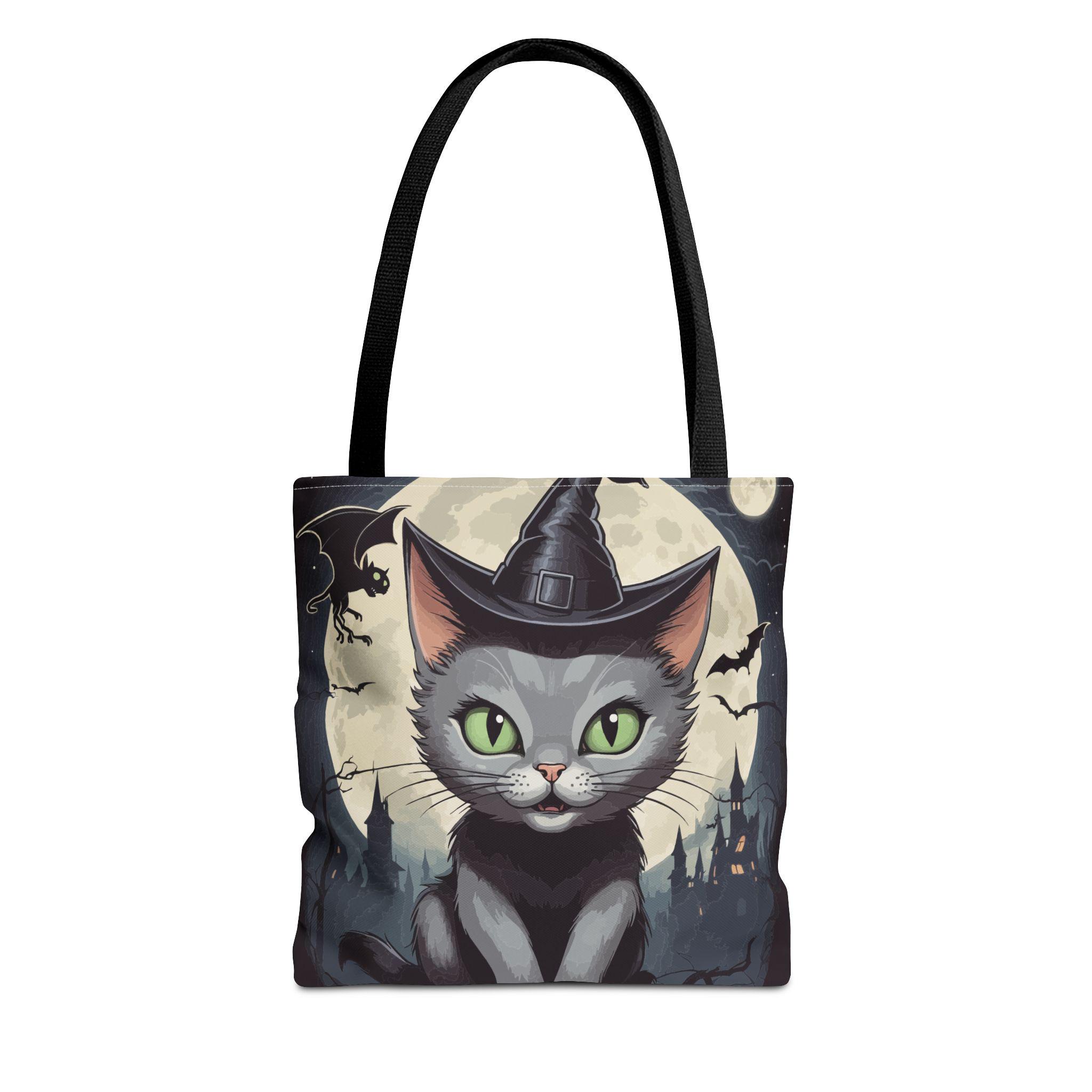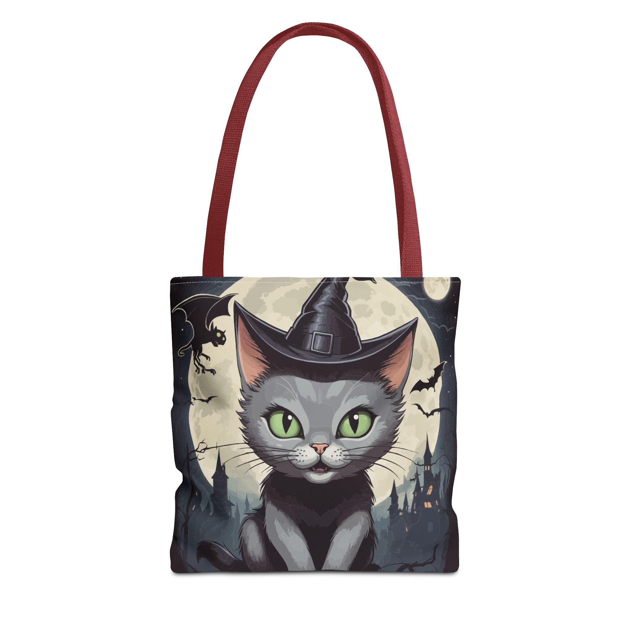 This Black Cat Tote Bag is the purr-fect accessory for Halloween lovers. Show off your feline spirit with this All-Over Print (AOP) bag, ideal for trick-or-treating or as a spooky-themed gift. Available in 3 sizes to add both functionality and style, these custom-printed tote bags come with multiple handle colors to match your designs. Made with spun polyester, these bags feature double-stitched seams, cotton webbing straps, and nonwoven laminate lining for high-end durability. Your all-over print is created with dye sublimation for high-end visuals.