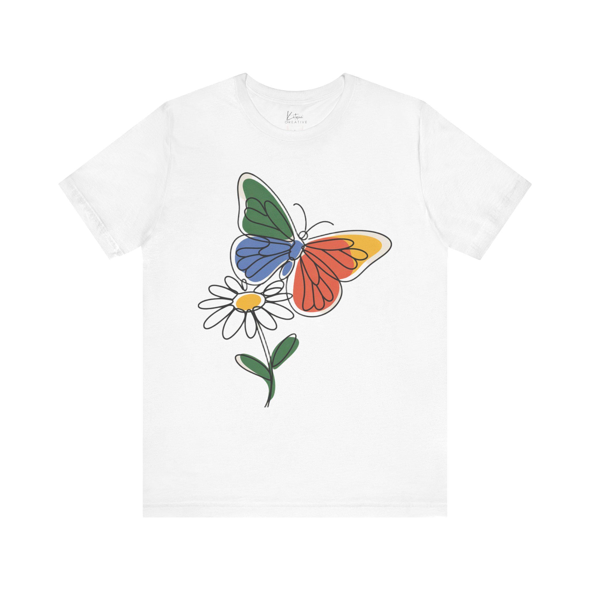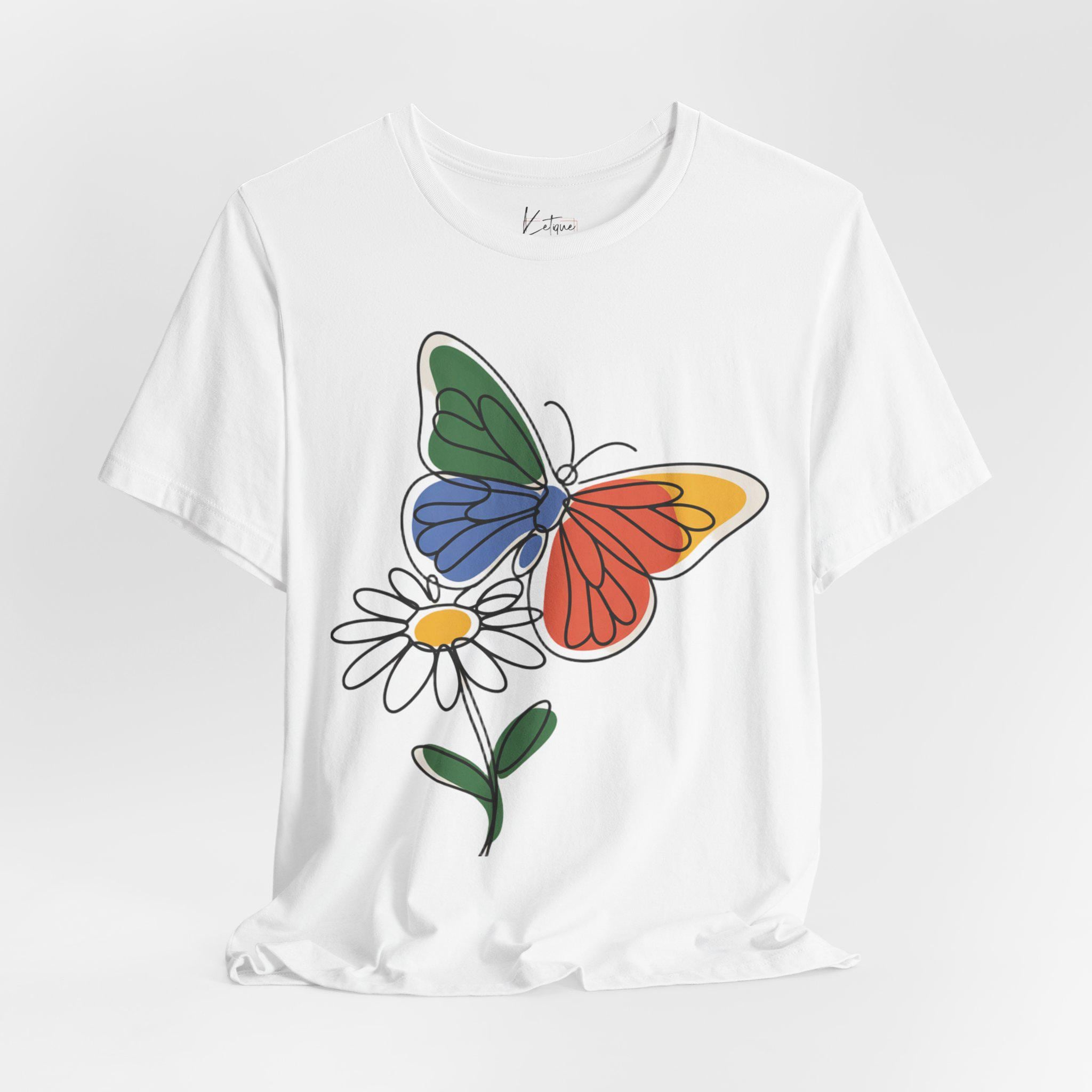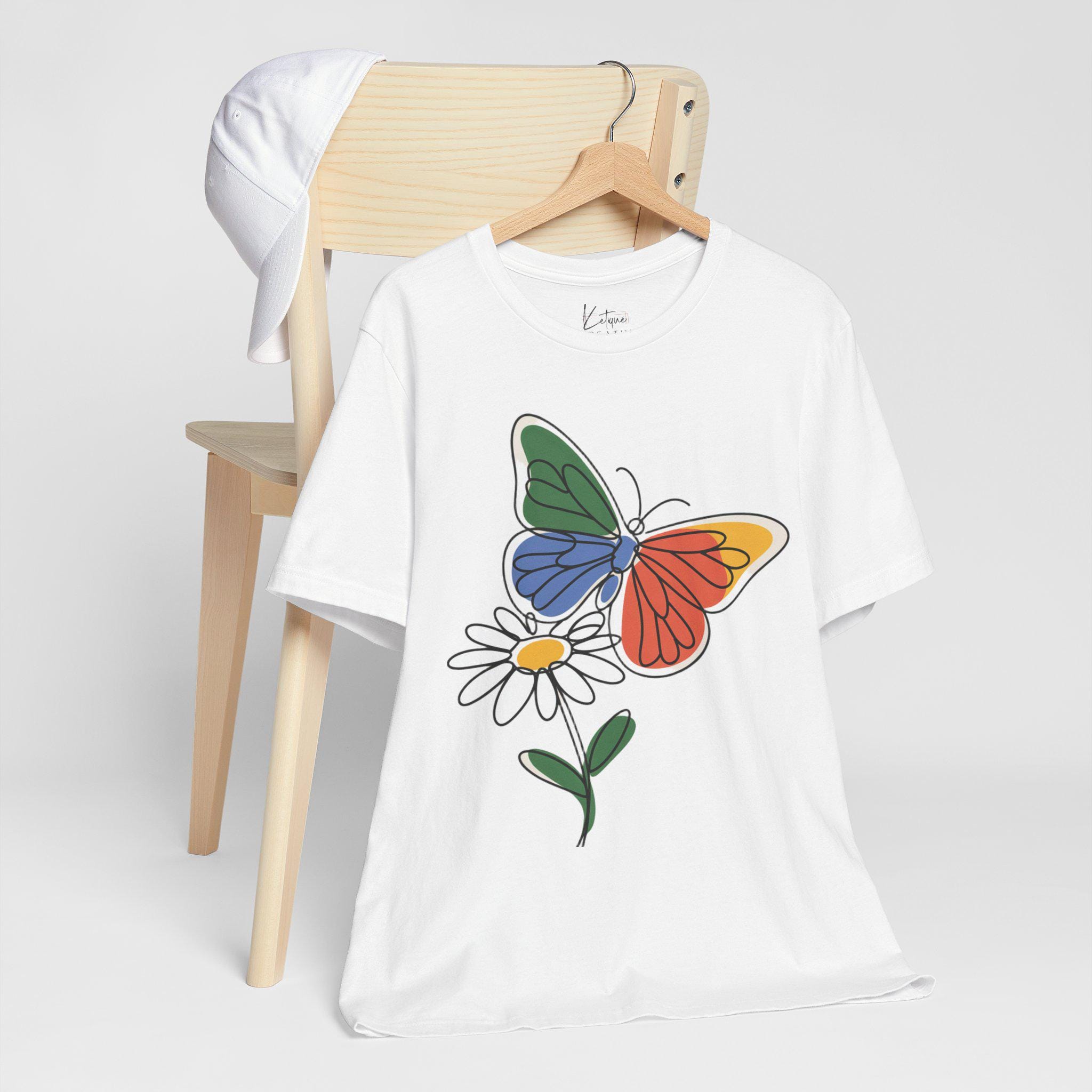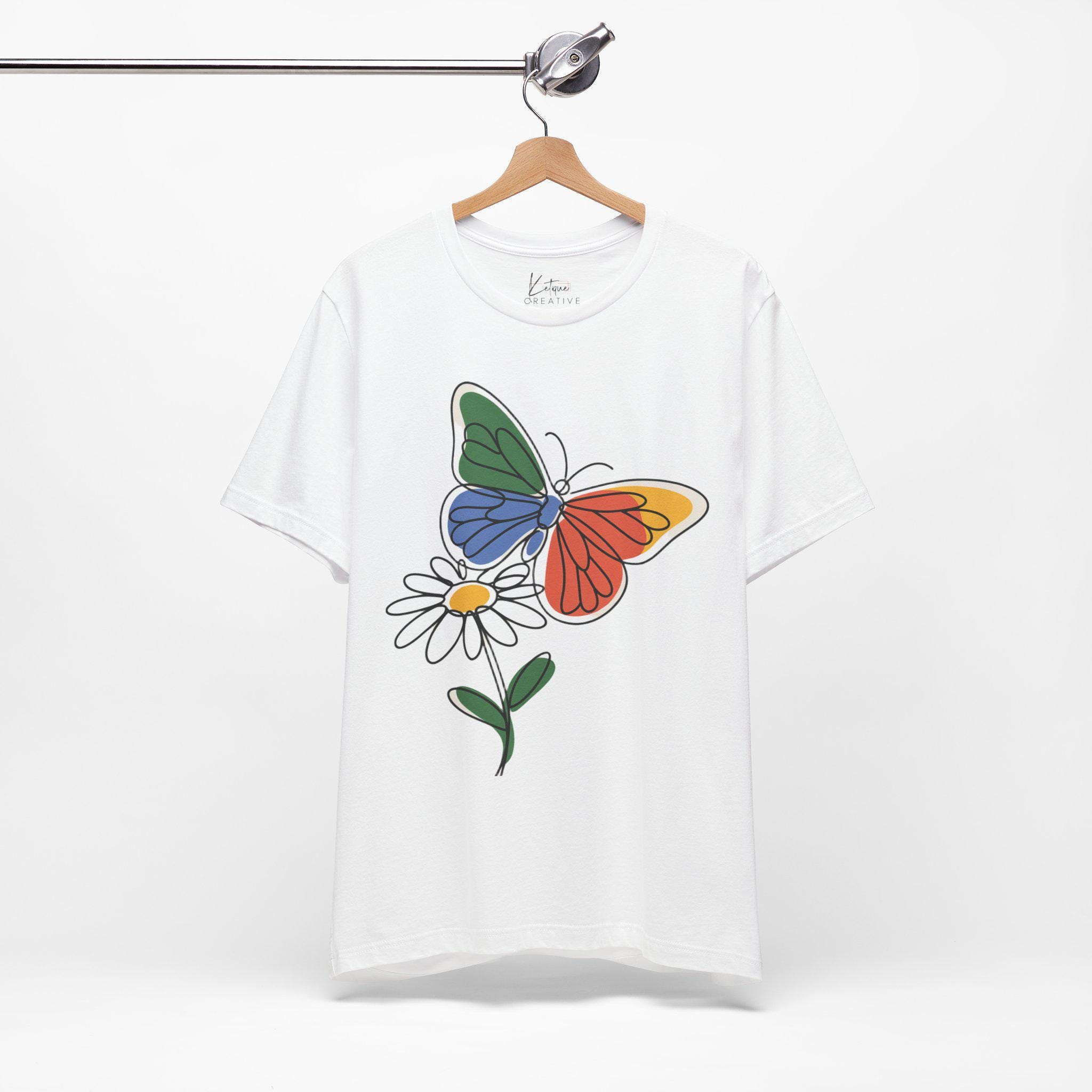 Colorful Butterfly Line Art Floral Tee that adds a vibrant and artistic touch to your wardrobe. Perfect for those who enjoy nature-inspired designs and want to stand out. Suitable for casual outings, nature lovers, and spring/summer occasions.